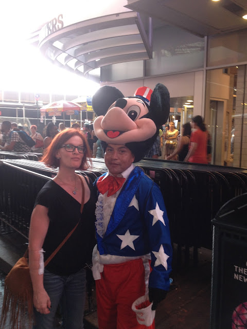 One night in Times Square we came across a guy taking a breather, sweat riveting down his face. I paid him for a photo and asked him not to pull his headpiece down. It's a "thing" for people to dress up in cheap polyester character costumes and pose for photos with tourists.